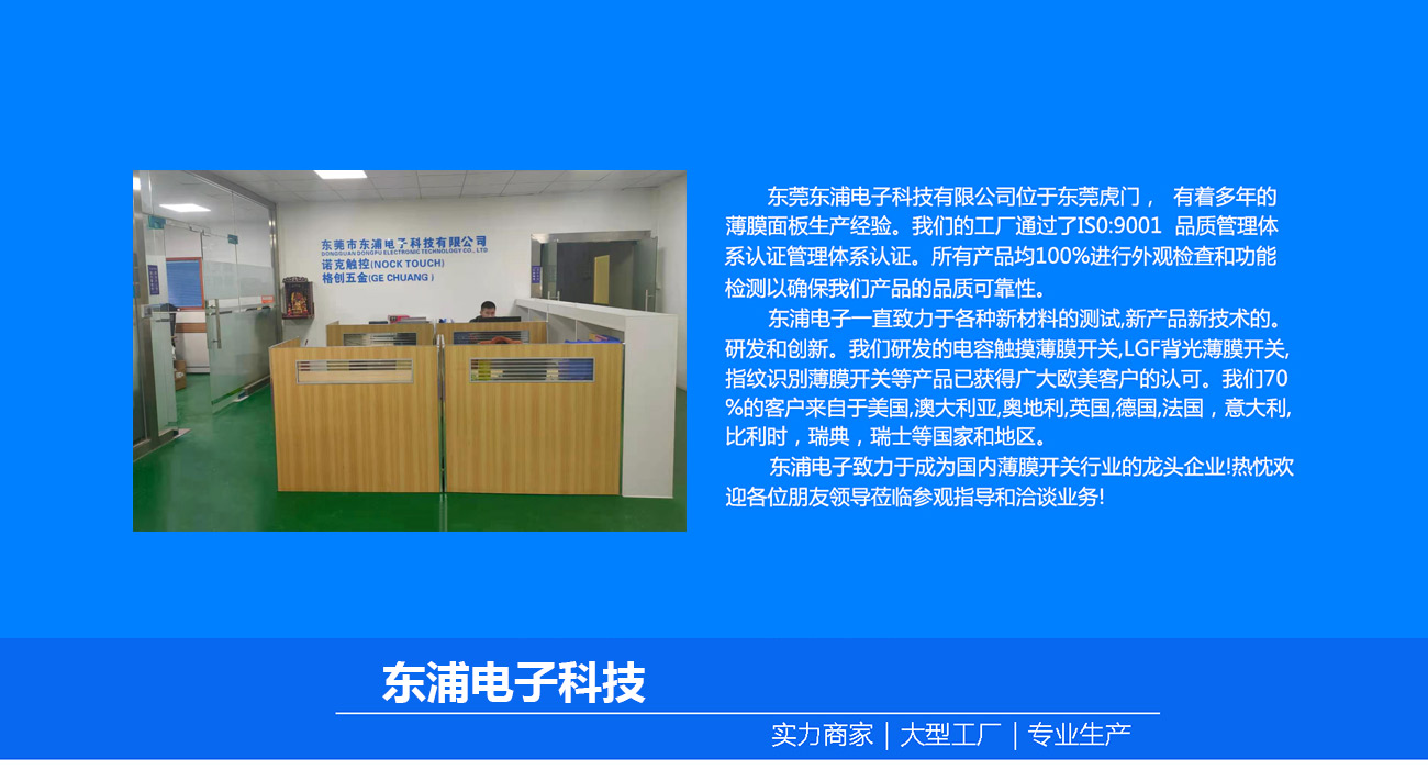 東莞市東浦電子科技有限公司成立于2017年,位于東莞市虎門鎮南柵社區第六工業區工業園內,占地1500平米。緊鄰深圳,廣州,香港,距離深圳機場僅30分鐘車程,距廣州機場1小時車程,東浦薄膜開關,PCB/FPC薄膜開關,硅膠按鍵開關,背板薄膜開關,醫療抗菌薄膜開關,醫療感應電極,戶外防水防紫外線薄膜開關,薄膜面板,硅膠按鍵,銘板標簽,屏幕貼合,ACF貼合,硬性電路板組裝,柔性電路板組裝,銀漿印刷PET線路組裝,半成品組裝加工以及整機項目開發和組裝加工的高科技企業